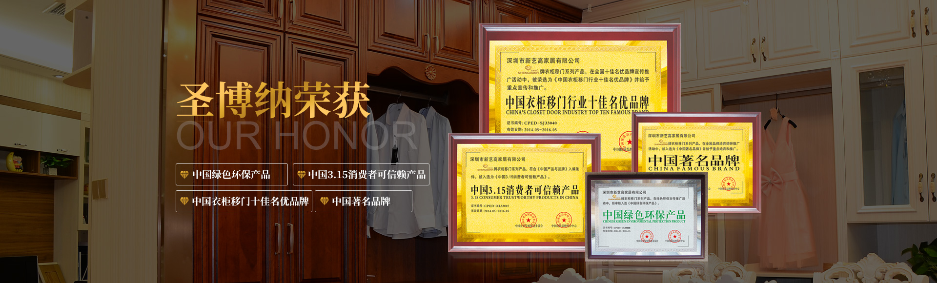 圣博納品牌先后獲得“中國(guó)綠色環(huán)保產(chǎn)品”,“中國(guó)3.15消費(fèi)者可信賴(lài)產(chǎn)品”,“中國(guó)衣柜移門(mén)十佳名優(yōu)品牌”,“中國(guó)著名品牌”,四大榮譽(yù);
